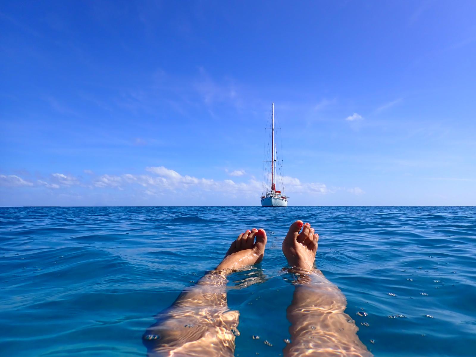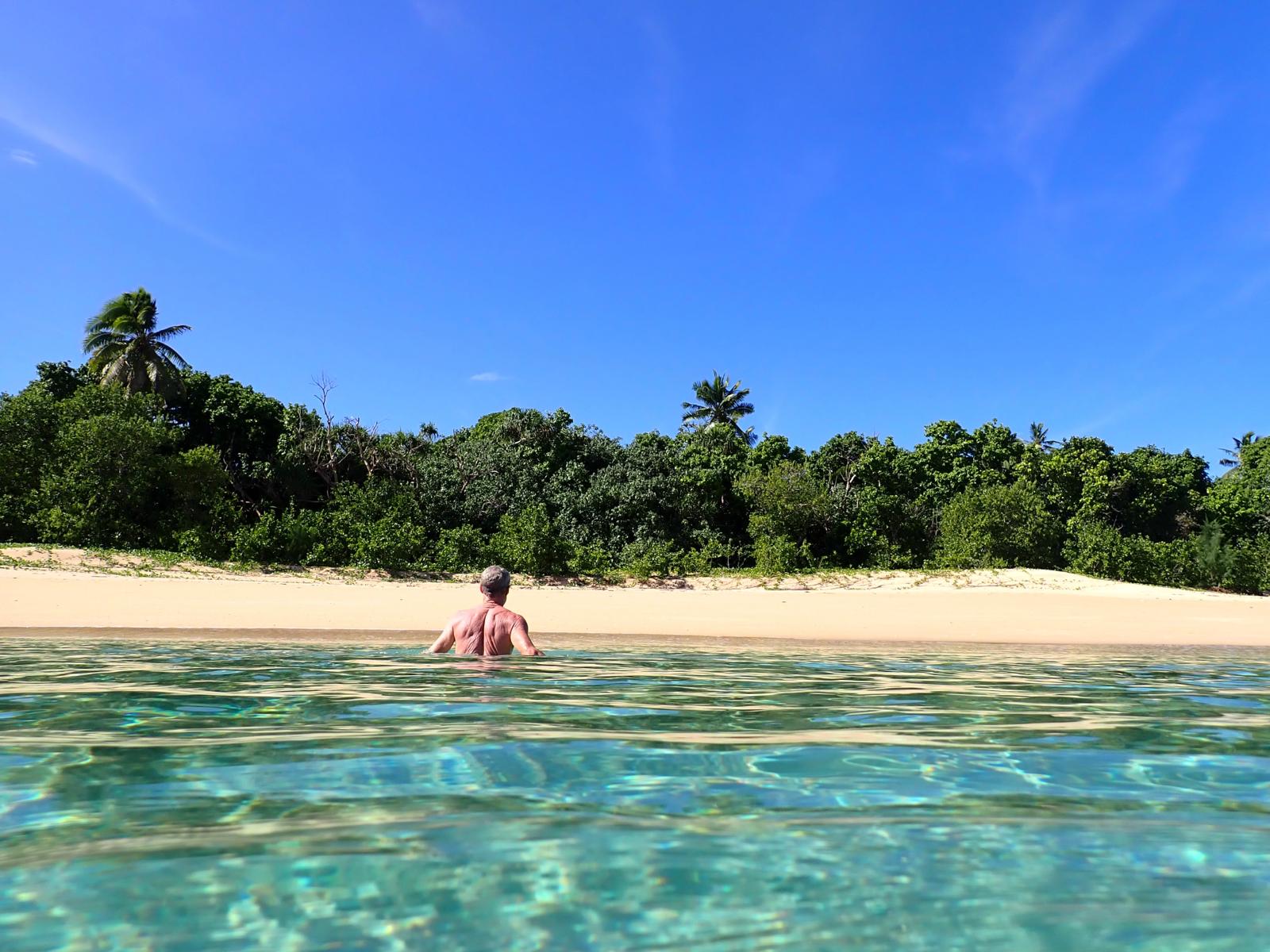 Today we left the dinghy tied to Imagine and we swam ashore. The water here is crystal clear. From the beach Imagines freshly painted white hull contrasts with the turquoise water and blue sky. I took the opportunity to dive Imagines hull and discovered that a fishing line was wrapped around the propeller. I couldn’t hold my breath long enough to cut it free, so I had to use the Hooker Dive gear. Another job done!