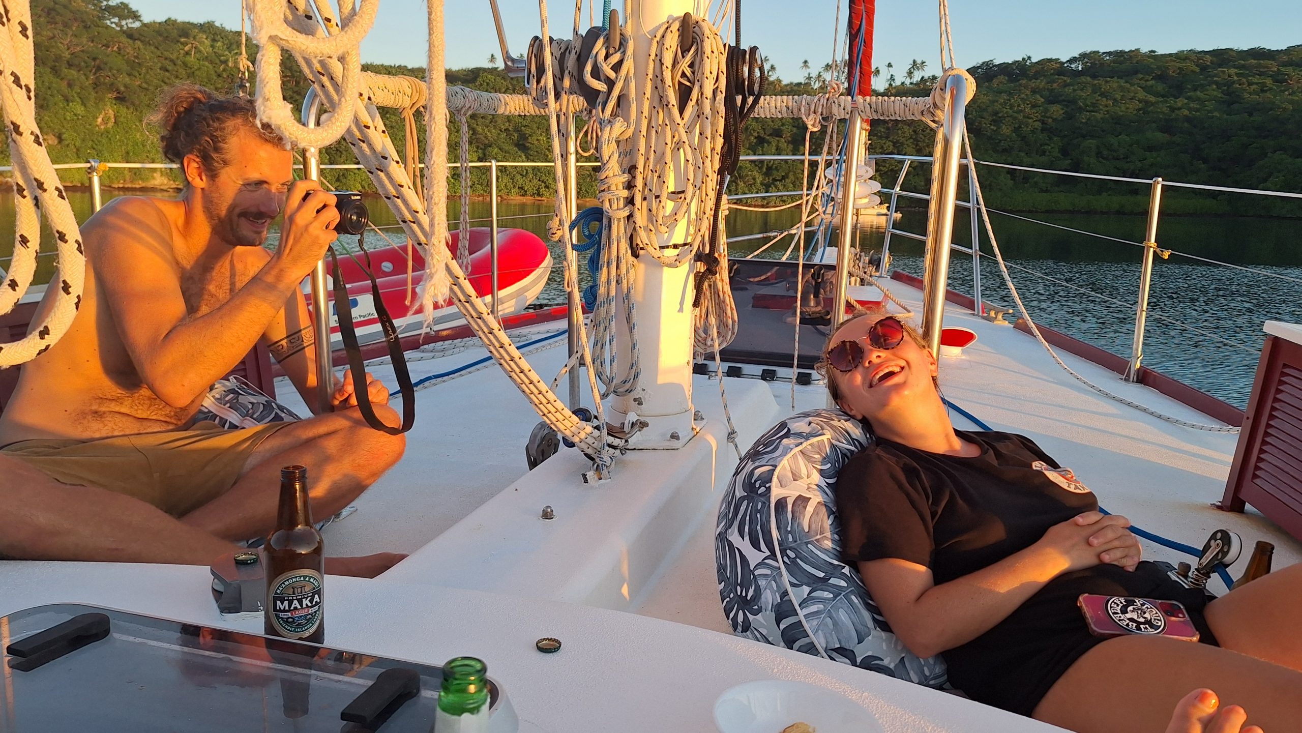 Later in the morning I went to climb the mast to repair a light when we discovered some wasps hanging around the main sail. It looked like there was about a dozen trying to make a nest in the folds of the sail. I carefully sprayed the sail with vinegar and water. That dispersed them for a while, but they came back. So we hauled anchor and raised the sail. We sailed for half an hour around to the next bay, but they still hung around. As I dropped the sail I sprayed it with vinegar again. It seemed to keep the wasps away. No they just moved to the mizzen sail! It took about an hour of spraying but they seemed to have left.