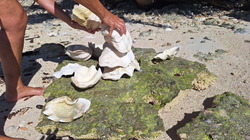 During our circumnavigation of Euakafa Island on Thursday, we came across a beach full of clam shells. So Friday morning we went back there to have a better look. B made a sculpture out of some of them.