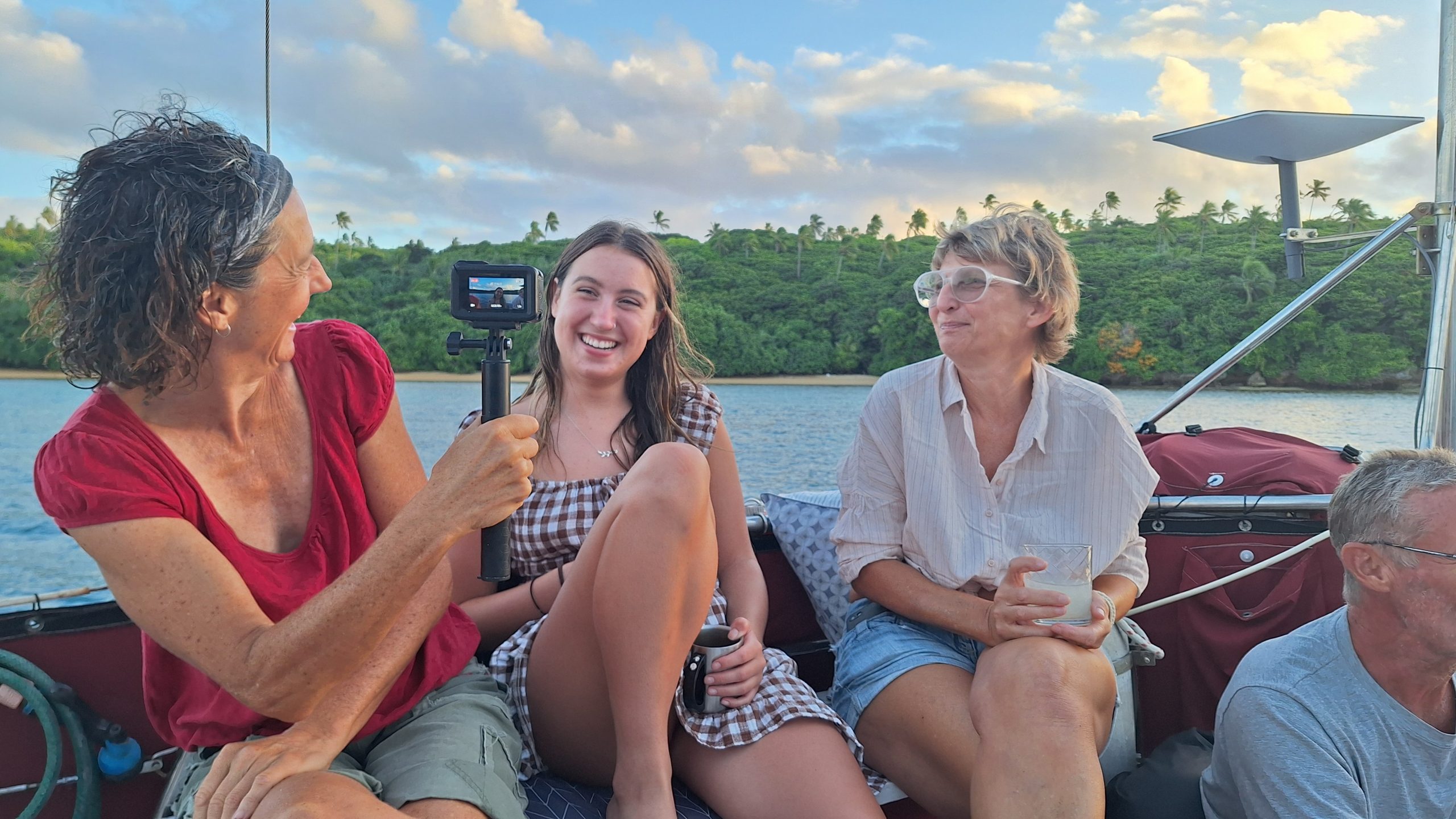 This morning was work time. Nolwenn and Fabien started cleaning the barnacles off the hull. B cleaned the stanchions and I did a few other jobs. We had seen Norla and Sansabar (two boats we had met in Nukualofa) had anchored at a neighboring island, so we hauled anchor and went to join them. This evening the crew from both boats joined us on Imagine. Samuel from Norla brought his guitar and played a series of his own songs while we sat around with drinks and nibbles. Then we all chatted and exchanged stories.