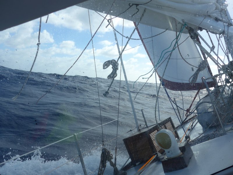 We were all woken up by an early morning tap on the hull.. Darren had noticed we had left the hand cart I had used to get the batteries. So he delivered it by kayak. The whole bay was calm so I took the opportunity to go up the mast to repair a light. After breakfast we left the comfort of our Tindalls Bay anchorage around 10am Tuesday into a comfortable 22 knot southeastern breeze with following seas off the rear quarter. Not only would the 18-20 hour journey put us in good position for what may come, it also meant the first chance for crew to practice the “2 hours on/8 hours off” helm shift rotation intended for the passage to French Polynesia.