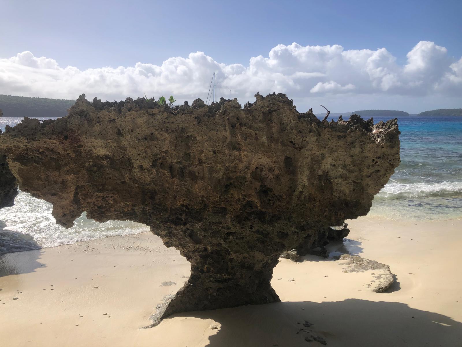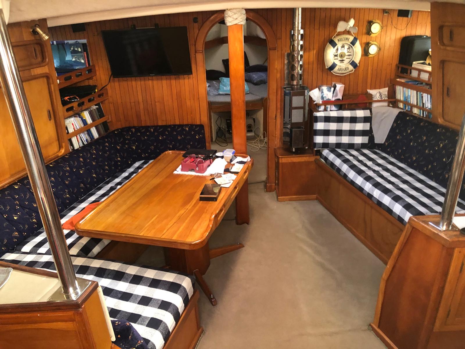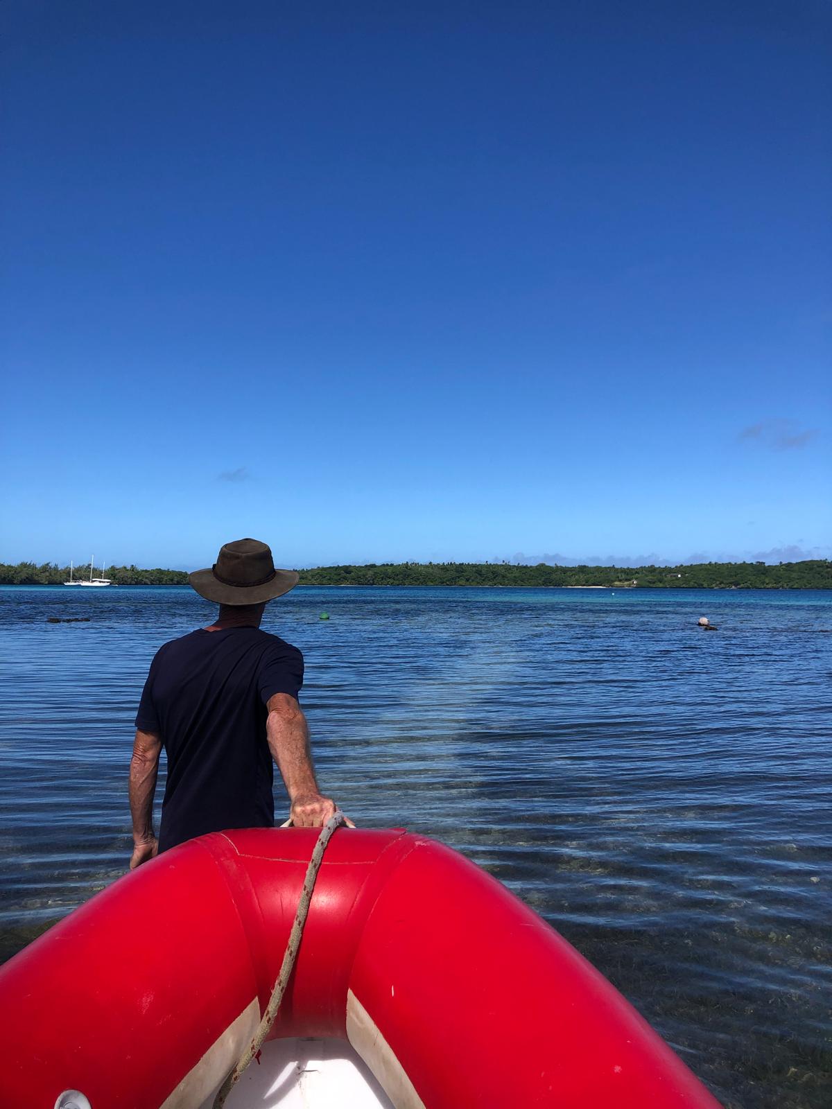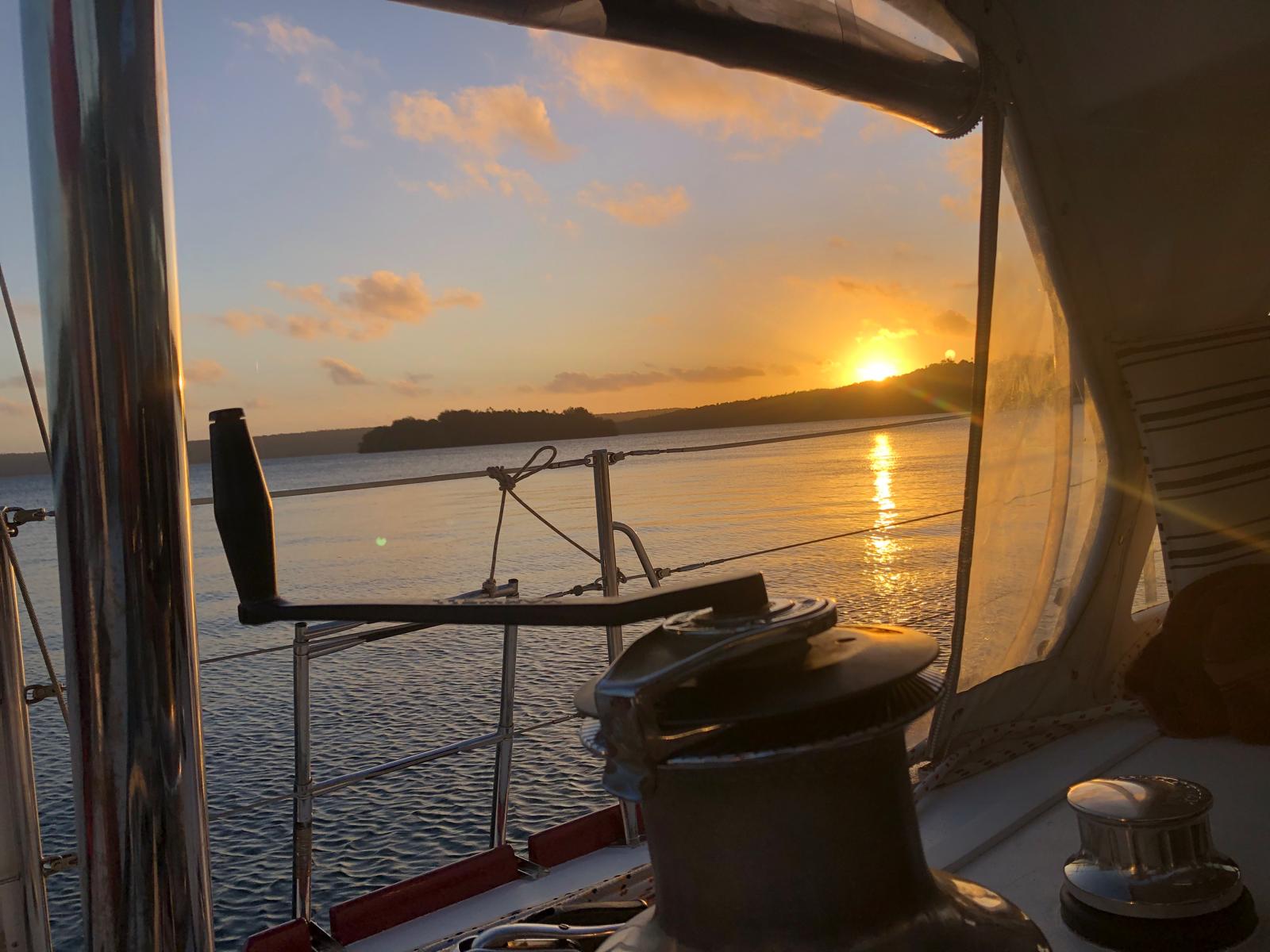 We have sheltered in a bay, where we have been before. We took a walkalong the beach to the reef at low tide. The rain has started, so what do we do on rainy days? We reupholster the seating. It is taking us a long long long time, nothing is straight, neither square and we haven’t choose the easiest pattern, but we have now completed the cushions seats and now have just started on the backs.